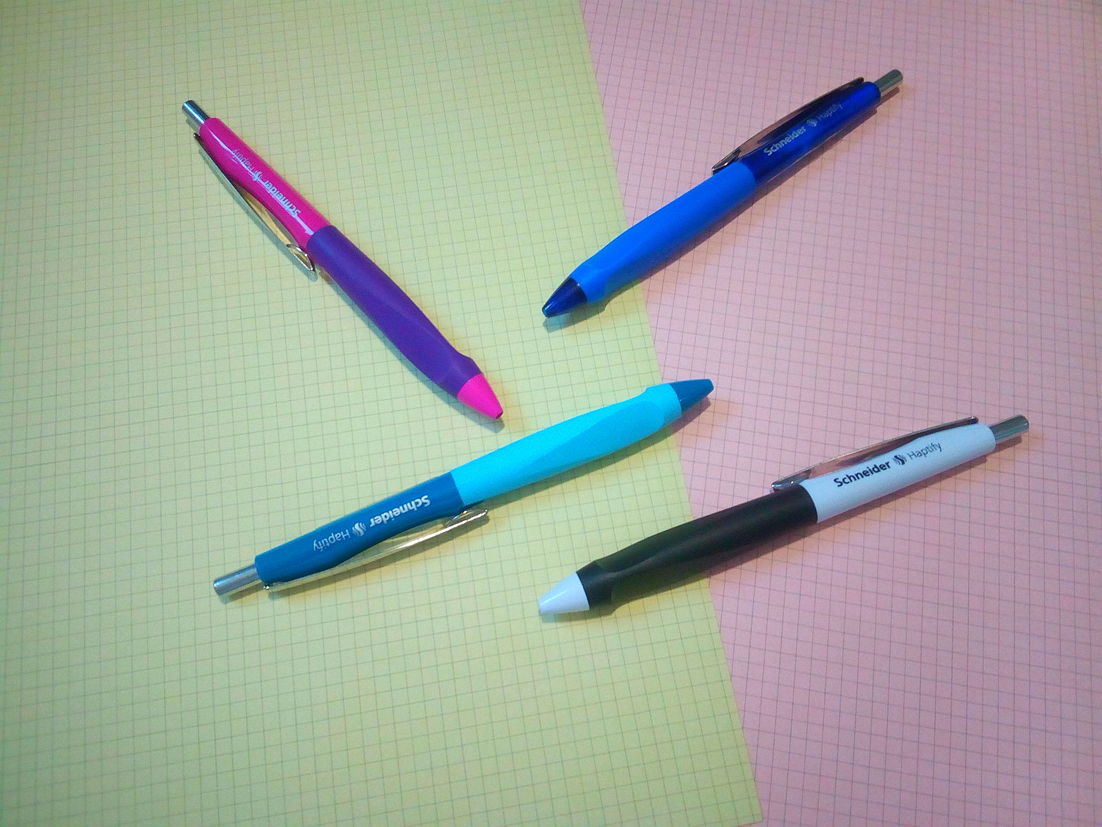 - golyóstoll: Maped Visio, Schneider Haptify, Schneider Edge XB 0.7, Pentel BK437