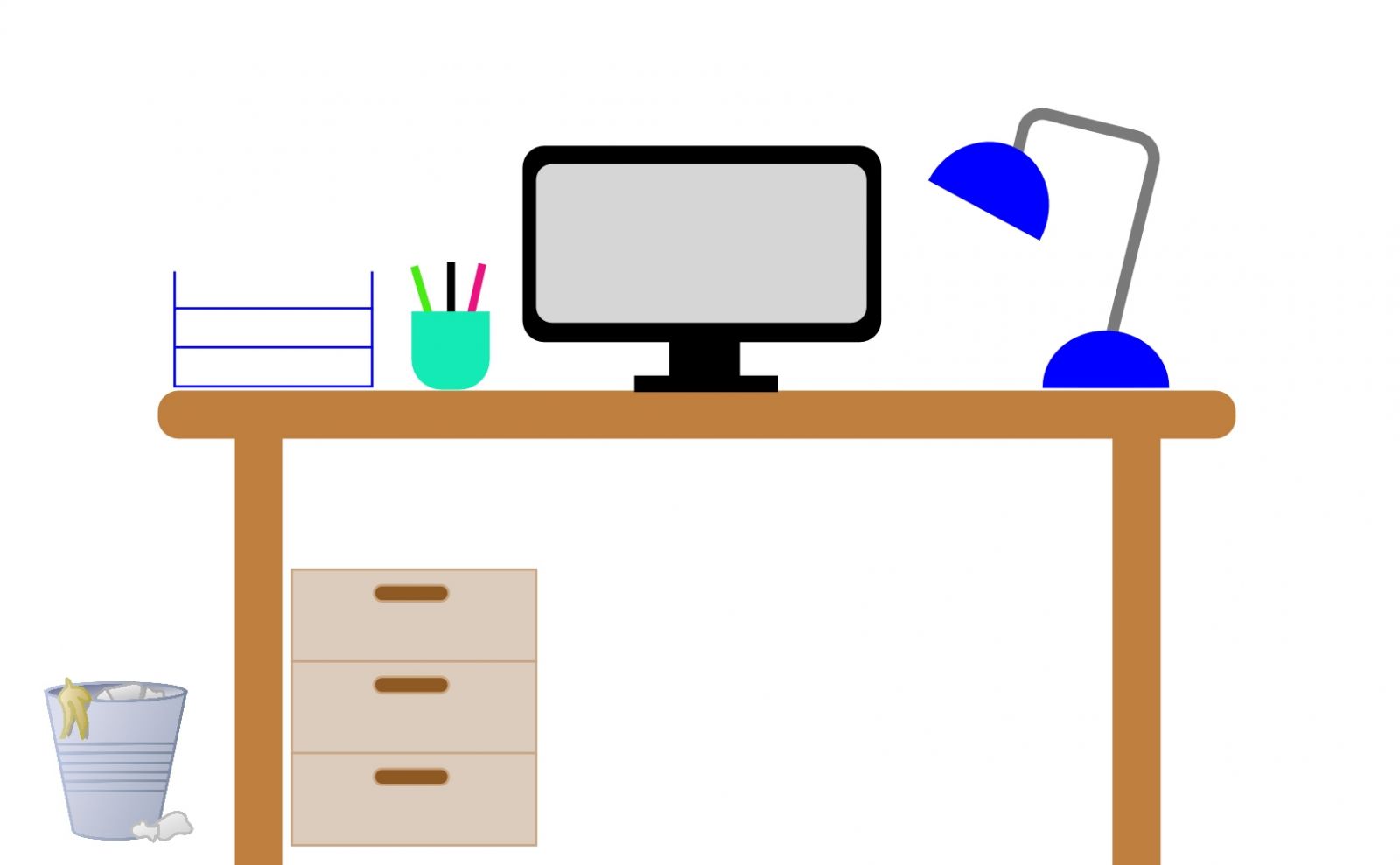 - A gyakran használt eszközök kerüljenek a bal térfélre. Ilyen lehet: ceruzatartó, irattálca, jegyzettömb, fiókos konténer, szemetesvödör.