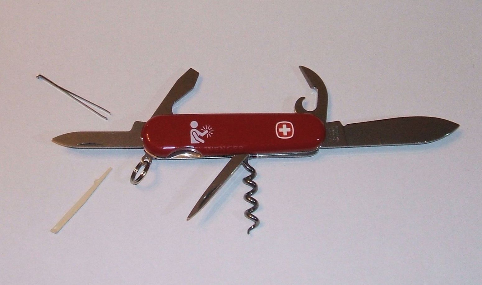 Az eszközök a balkezes használat szerint vannak elhelyezve benne, a kényelem és biztonság megteremtése érdekében. A dugóhúzó spirálja fordított irányú, a nyitáshoz használt hüvelyujjköröm bemélyedés a pengék megfelelő oldalán található, a jobbkezes változathoz képest fordítva.